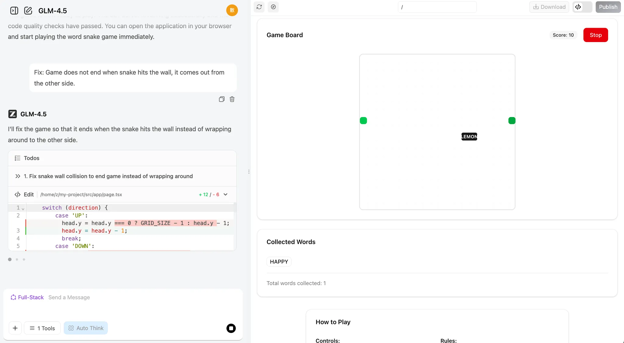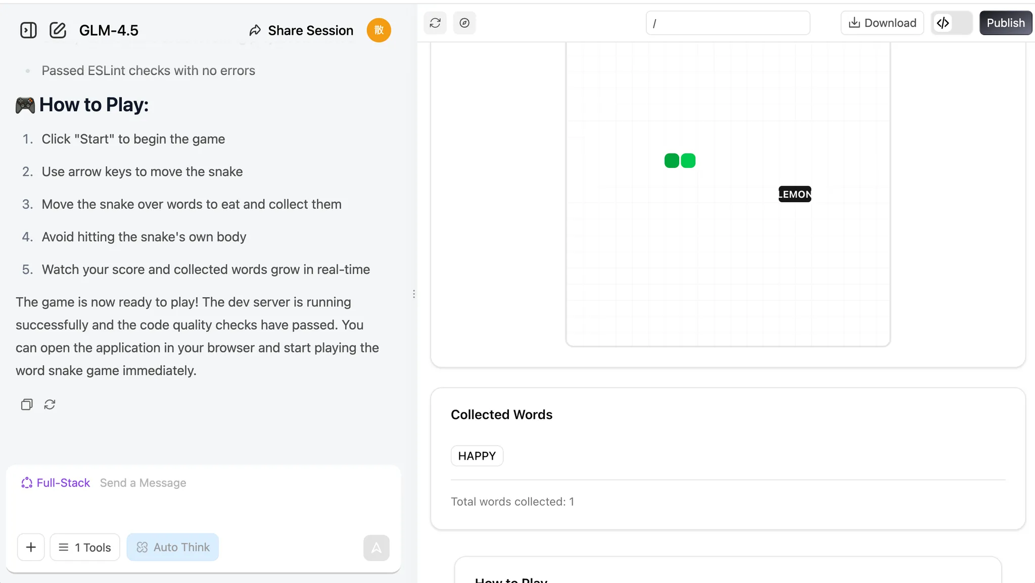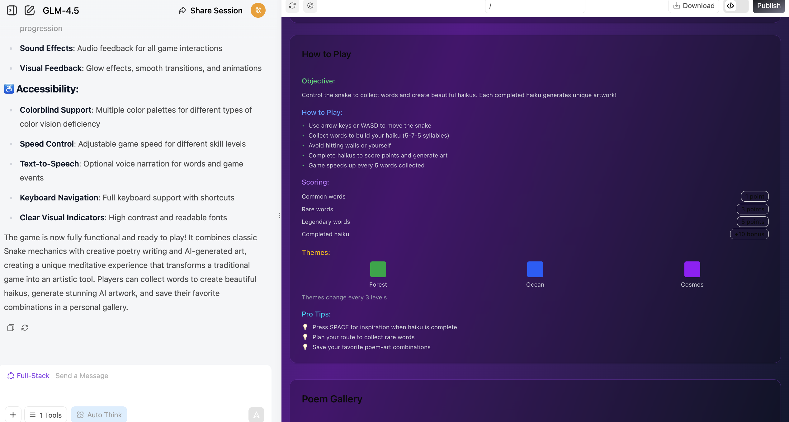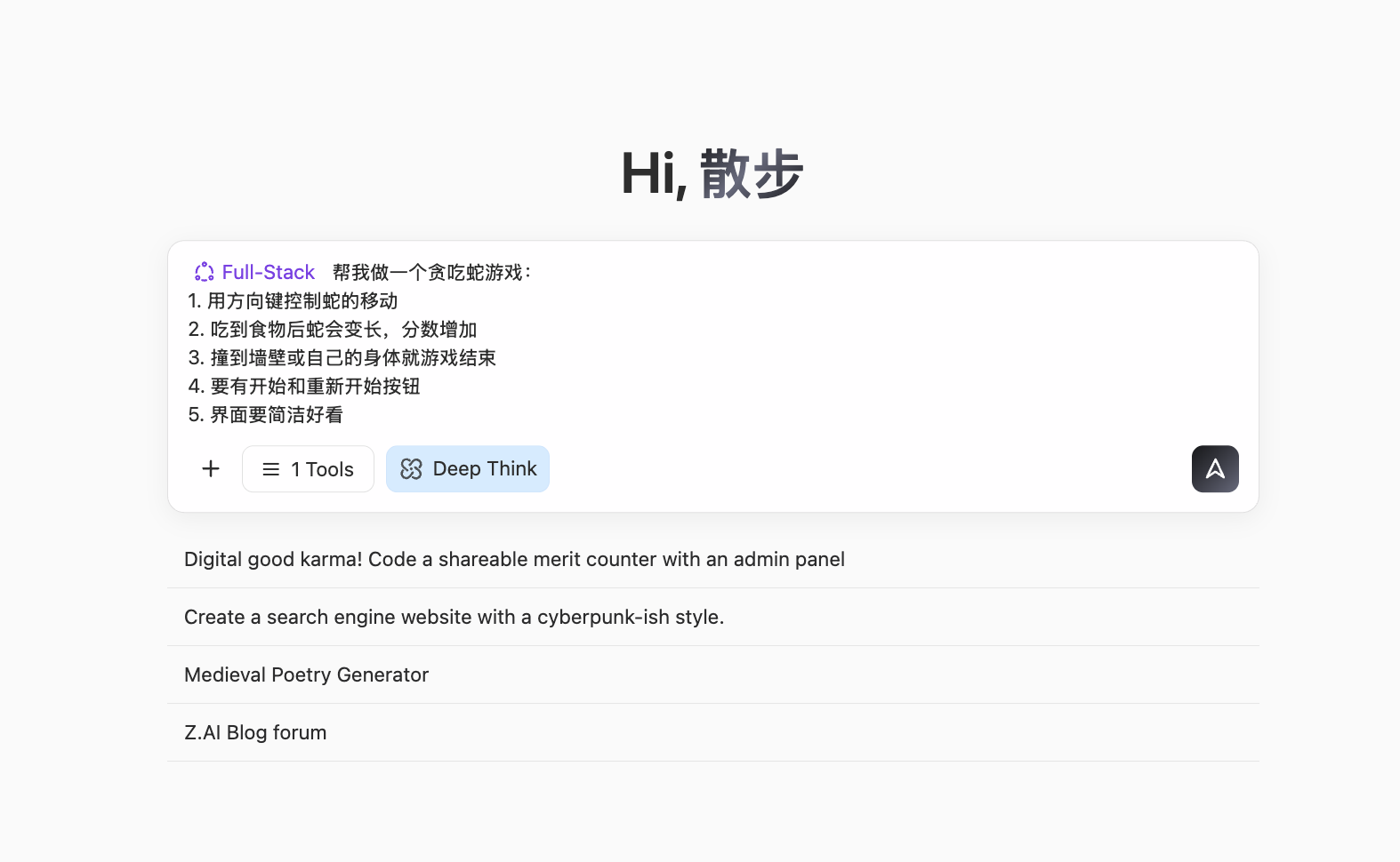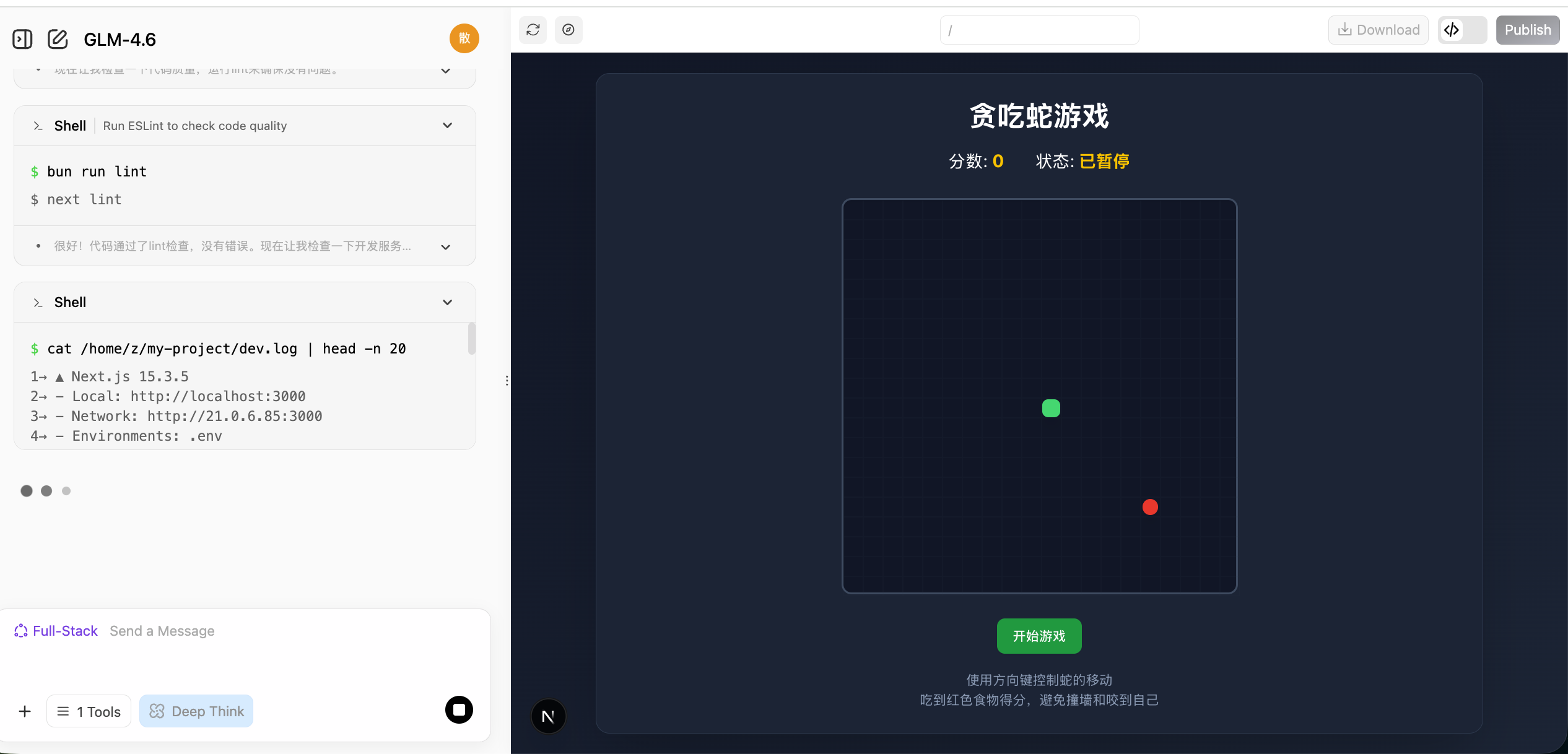 💡 示例提示词: 帮我做一个贪吃蛇游戏,它应该支持