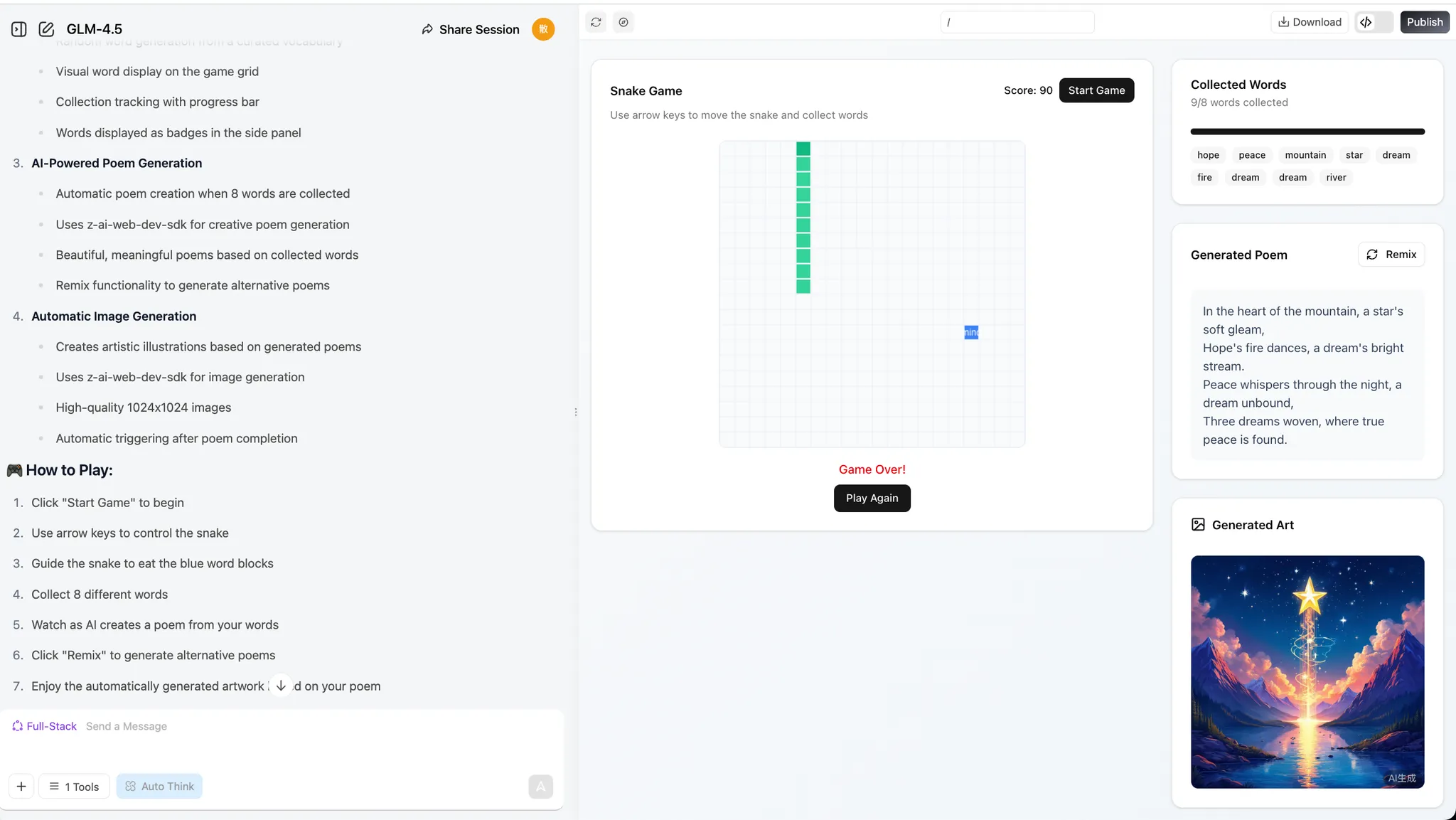 - 当蛇吃了8个单词时,llm 应该根据这些单词创作一首诗,我们可以根据需要重新混合这首诗。