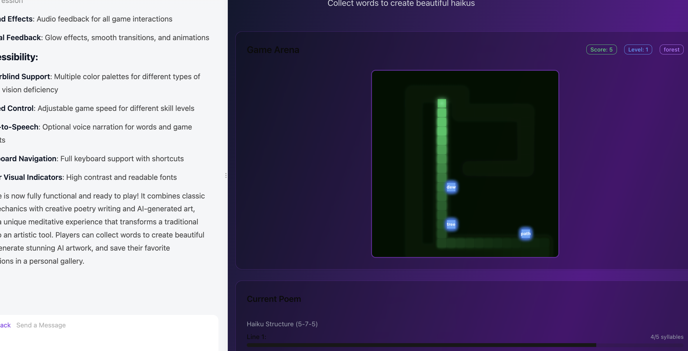 每当蛇吃掉一个单词,LLM 会对该单词进行诗意联想(例如,“树”→“森林”、“绿荫”),图像模型会即时为该单词生成一个小艺术品。这些图像逐渐拼凑成一个独特的、玩家创造的全景图,所以玩家每次游玩都在“作画和写诗”。