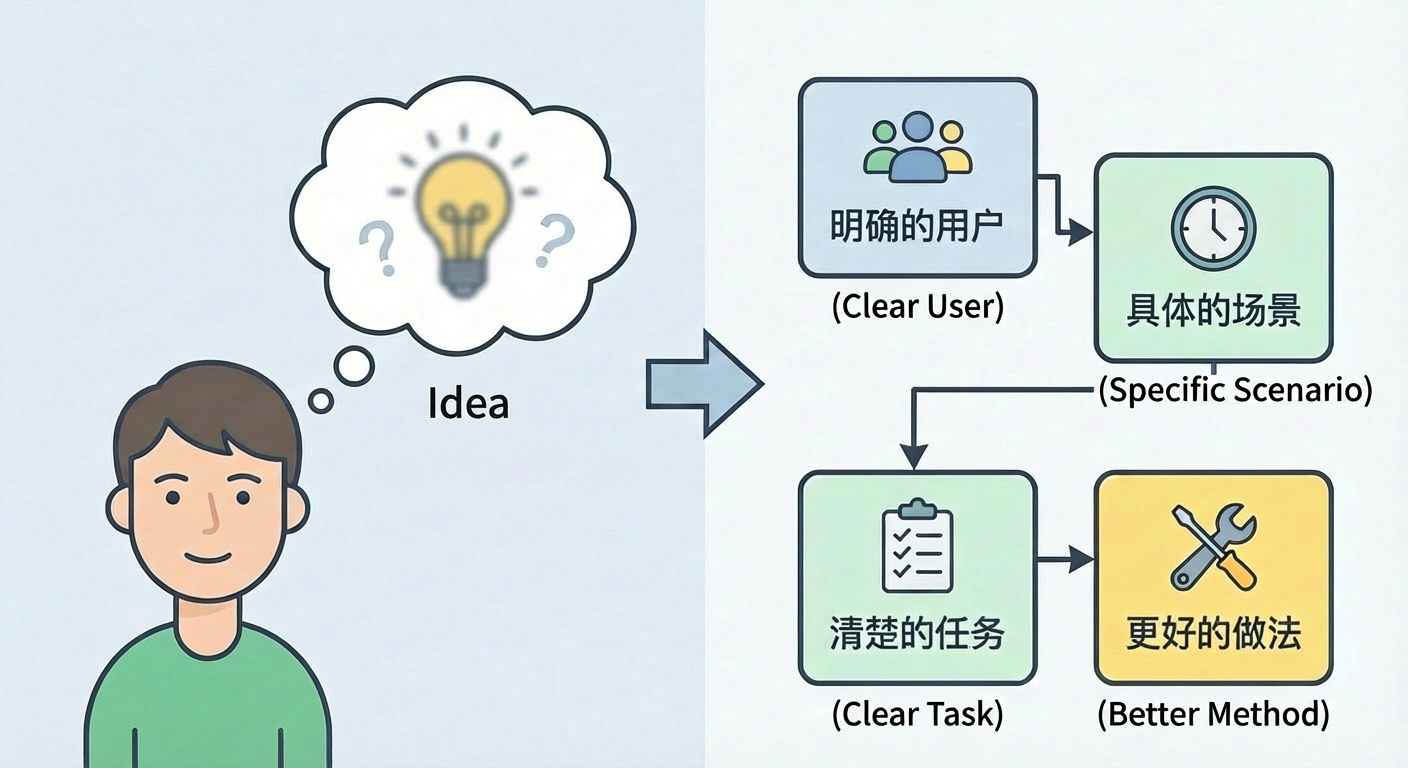 日常对话里,人们常说的点子,往往是一种非常主观的兴奋感。你可能在路上刷到一条视频,瞬间觉得这个方向好酷,于是心里冒出一句话: 我也可以做一个类似的。或者在聚会聊天时,大家一起吐槽某个产品不好用,你随口补上一句: 要是能有个东西,自动帮我把这些都搞定就好了。这个时候,你确实有了一种朦胧的念头,但它离一个可以做出来的东西,其实还差得很远。