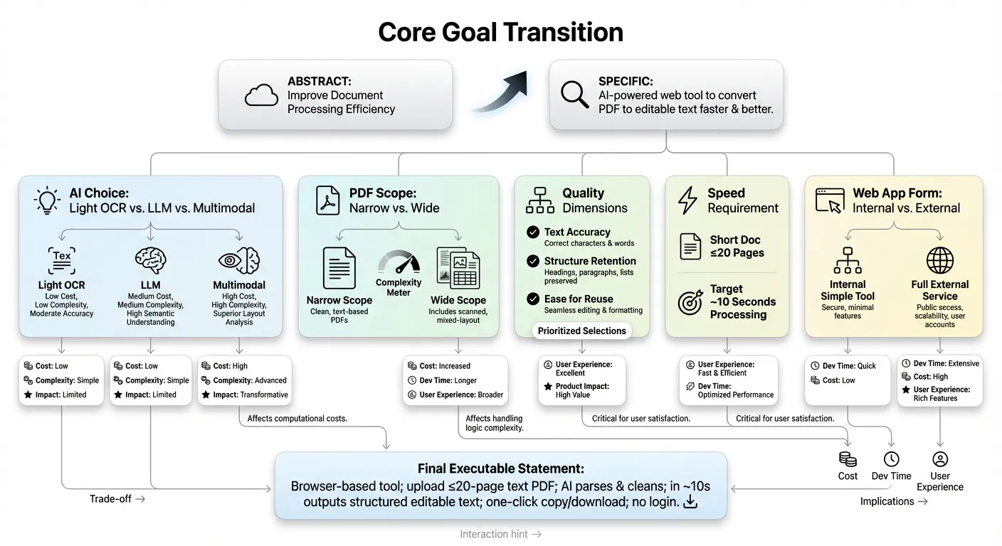 接着在第二章,你不再停留在想,而是 开始学会动手 。你学会在发散和**收敛**之间来回切换,用双钻的方式先把点子铺开,再按用户价值、可行性和时间成本 收紧到一个真正的可行路线 。你练习 从抽象到具体 ,把我想做一个提高效率的应用这类模糊愿望,一层层拆成最小可行动项,直到每一个步骤都变成今天可以动手的任务。你拿起白板或纸笔,先画再做,把一个应用分成入口页、操作页、结果页,画出用户从走进来再到拿到结果的完整链路。你也不会再把参考别人当成抄作业,而是有意识地 **分析别人的导航、表单、结果展示和引导流程,借力现成经验** 。同时,你不再等到产品完全做完才去问用户,而是在原型和半成品阶段,就有意识地边画边问,边做边问,让真实用户尽早介入你的设计。