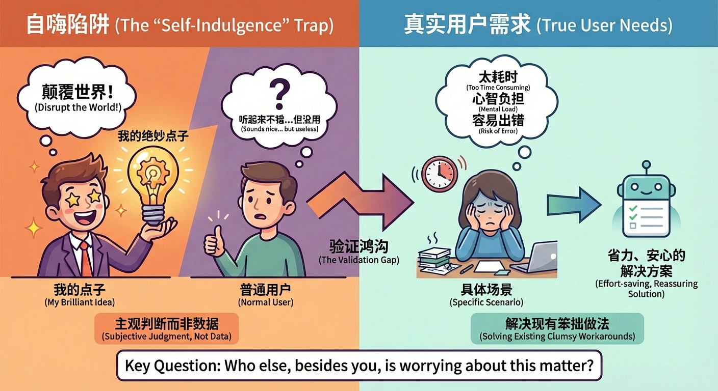 所以, 避免自嗨的第一道防线是了解用户需求。 在一开始你就需要逼自己回答一个看似简单,却非常关键的问题: 除了我自己,还有谁在为这件事认真犯愁。你可以去看论坛、社群、评论区,也可以直接问几个身边可能成为用户的人。如果你很难听到类似于“我每次都被这个事情拖住”或者“现在的做法实在太麻烦”这类带着真实情绪的抱怨,那说明这个点子离真实需求还有一段距离。