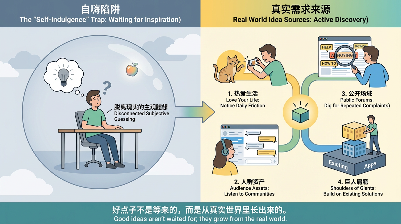 这些例子想说明的其实只有一件事: 你需要热爱你的生活,生活就是你最好的点子来源 。每天遇到的困惑、临时想出的变通办法、那些你觉得有点麻烦但一直习惯忍着的地方,只要你愿意稍微多看一眼,多问一句有没有可能用一个小工具来改一改,它们就都有可能变成未来的产品雏形。