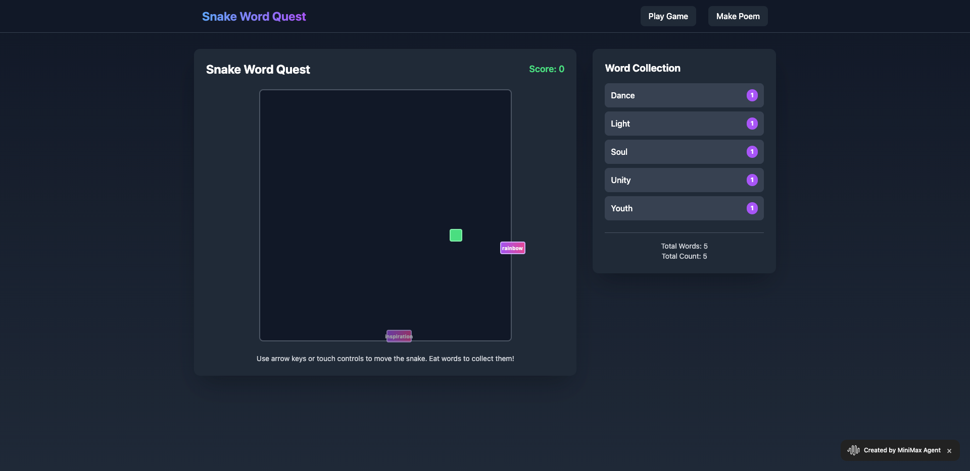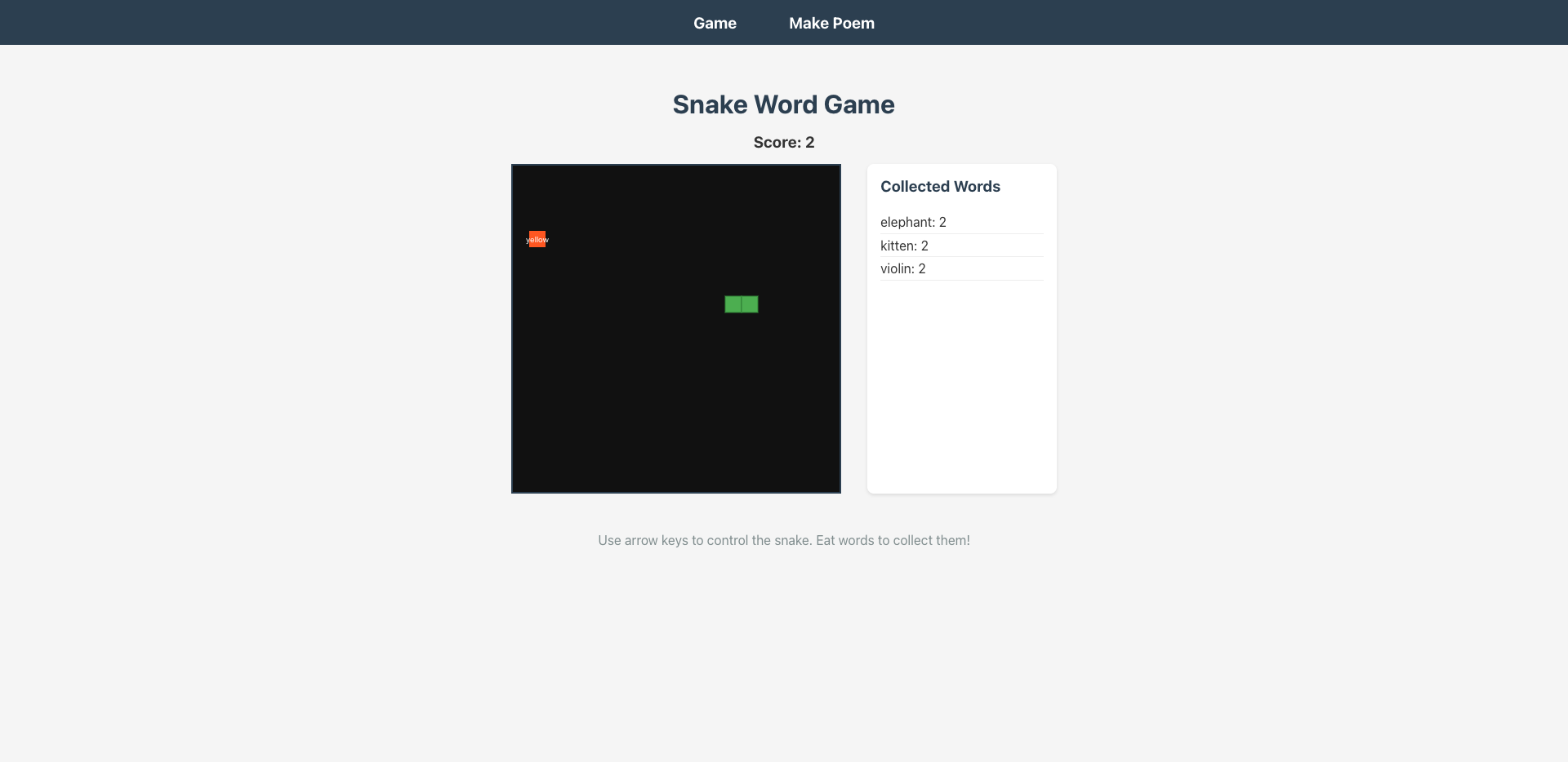 - 蛇吃掉的是英文单词,收集到的单词会在游戏结束后保留,并在新一局中继续使用。相同单词可以被多次收集,并分别计数。