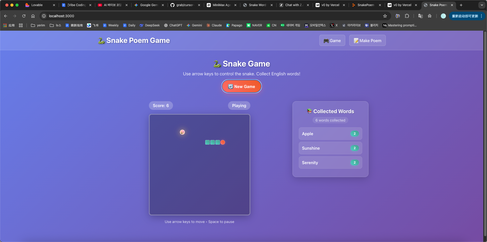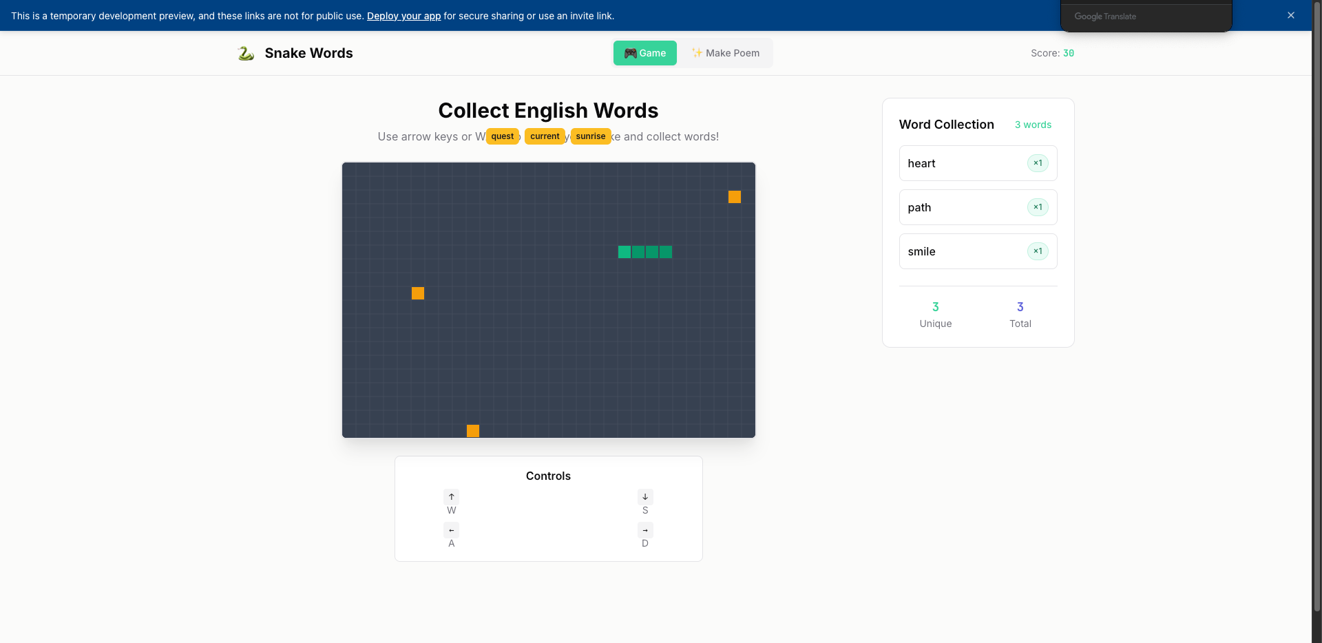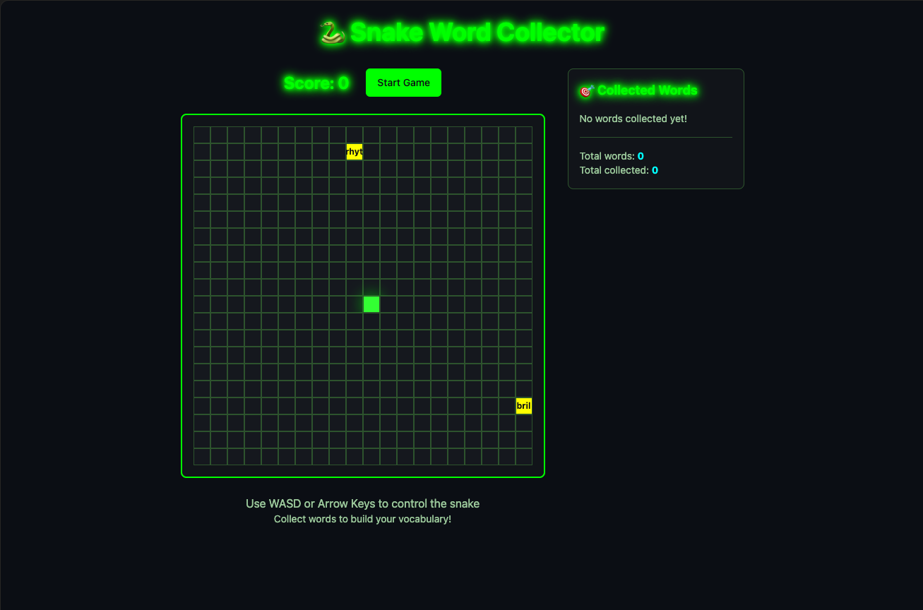 - 单词收集机制(单词出现在棋盘上,蛇吃掉单词后,侧栏列表更新)。