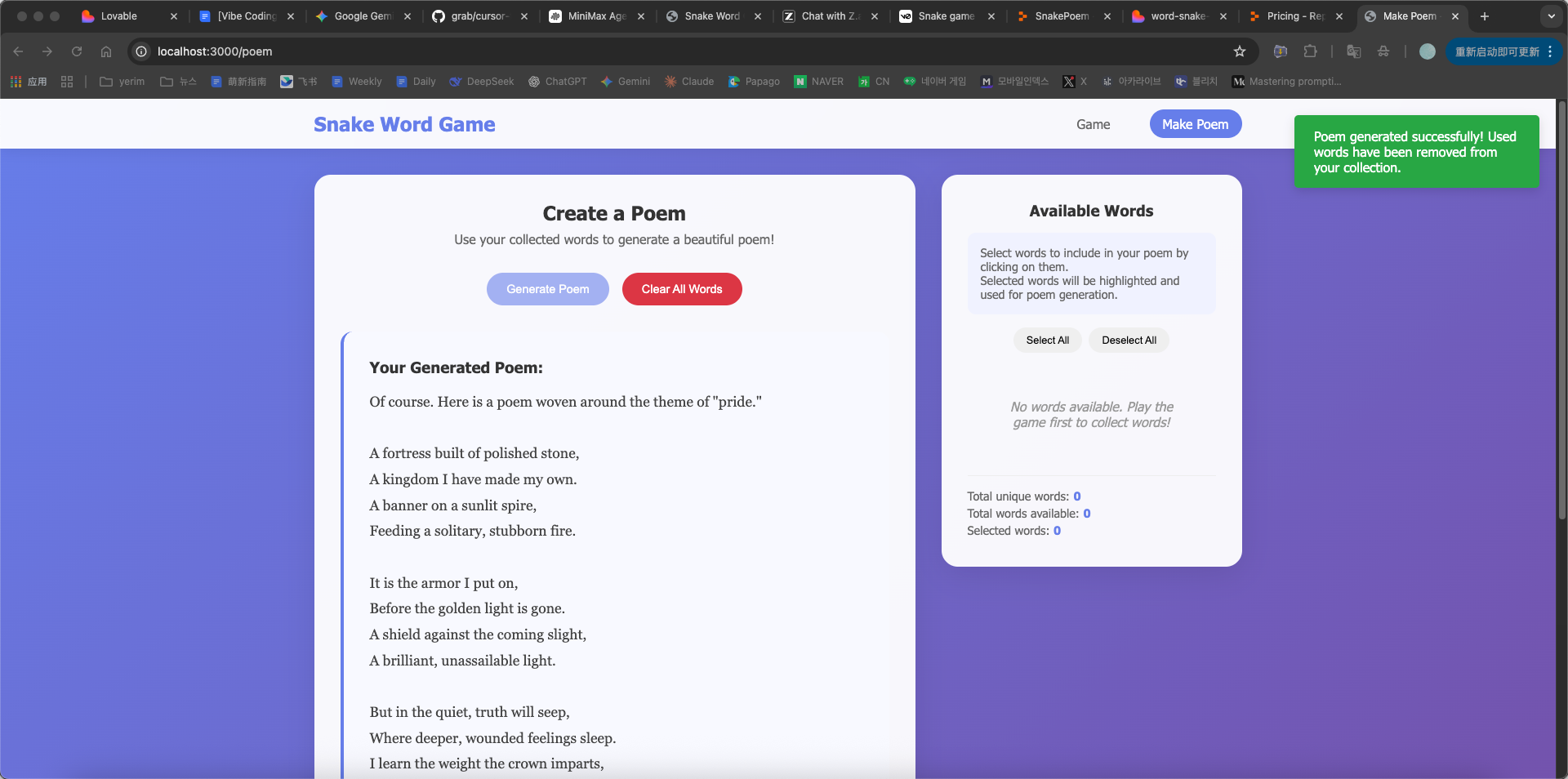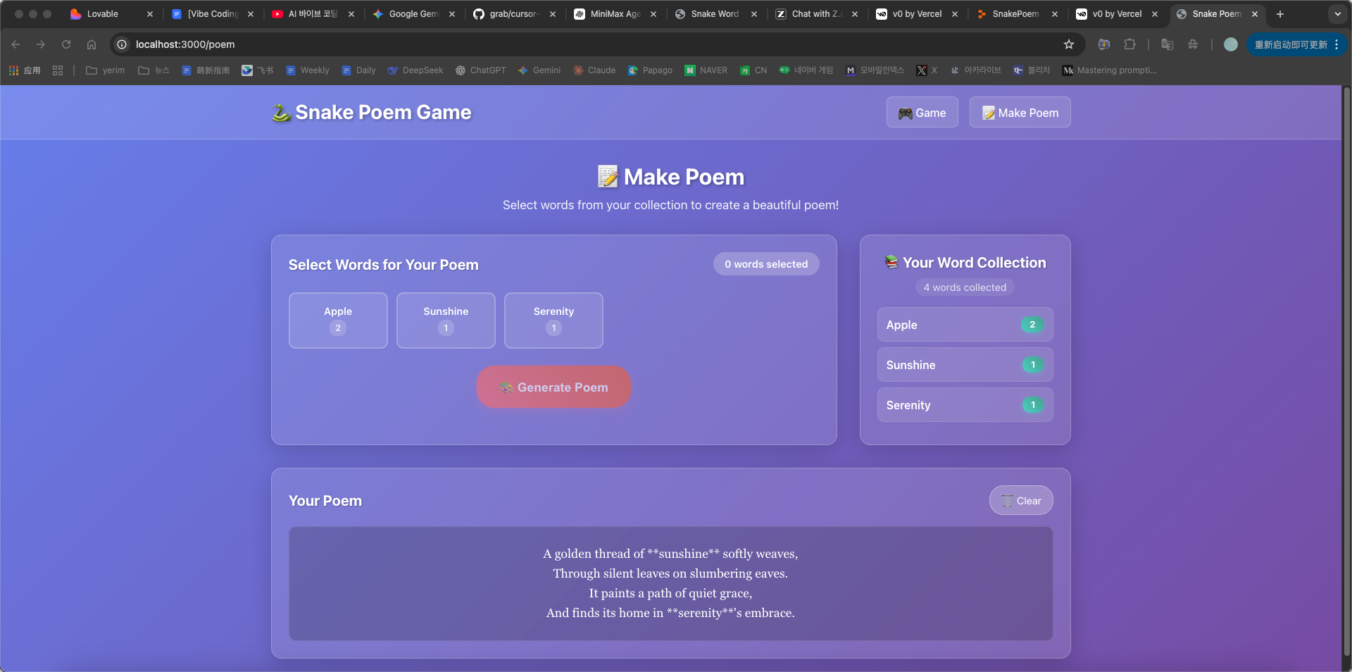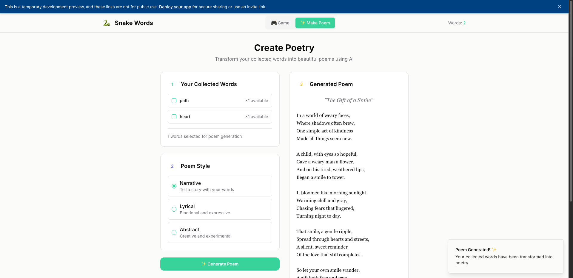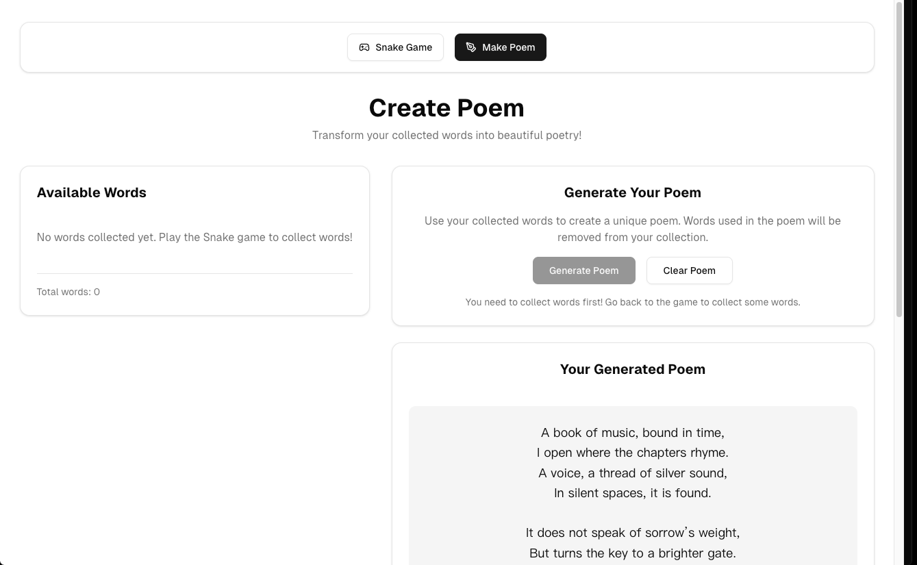 - 用户选择部分单词并点击 Generate Poem 按钮。