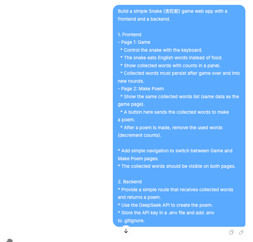 - 描述目标: 先用一句话或一段话描述你想要实现的功能,例如:“做一个带有 Python 后端、可以生成诗歌的简单贪吃蛇游戏。”