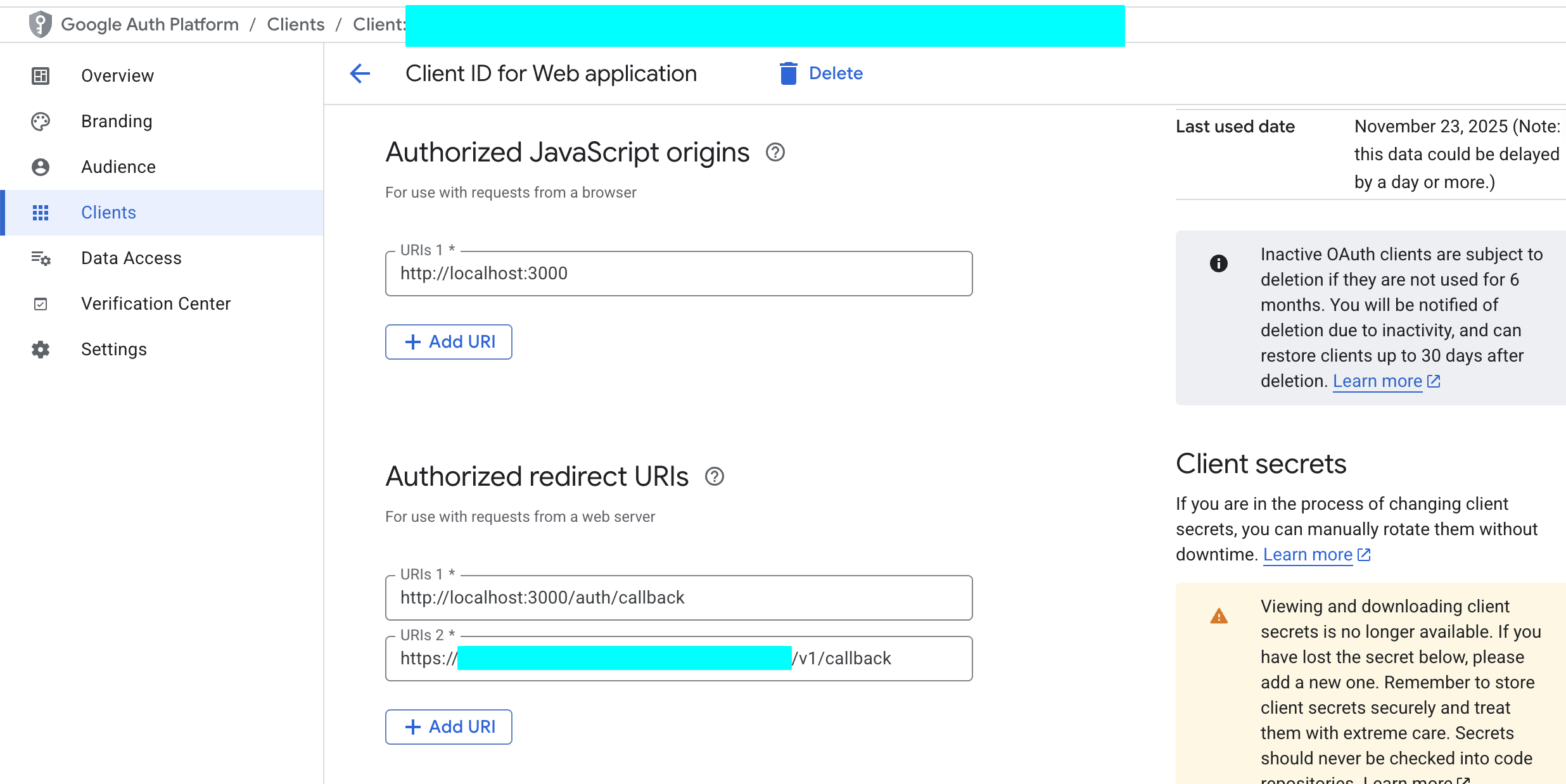 Authorized JavaScript origins:添加生产域名(如https://my-app.com、https://www.my-app.com),本地验证可补充http://localhost:端口号。Authorized Redirect URIs:粘贴从 Clerk 复制的地址。