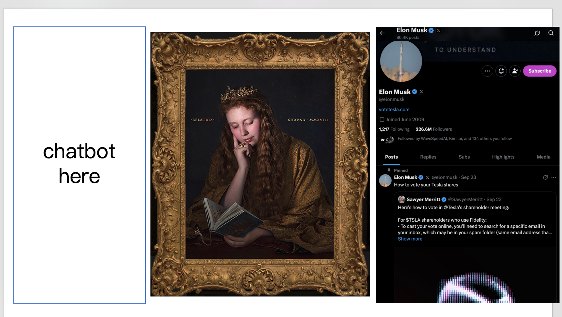 我们还可以先构思一下页面的原型,如上述所说,我们希望有一个对话页面和画像,以及一个有趣的个人介绍,在本篇例子中,我们实现了一个类似 X 上的对话界面替代个人介绍,你也可以想到其他符合"该人物特点"的方式,选取新的元素替换个人介绍栏目。