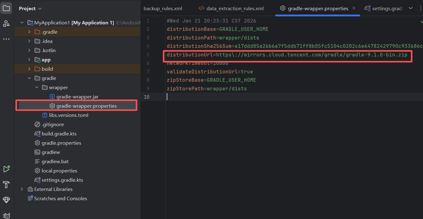在左侧项目文件目录中,依次展开 gradle -> wrapper,双击打开 gradle-wrapper.properties 文件。 将下载源更改为腾讯镜像源,如下: