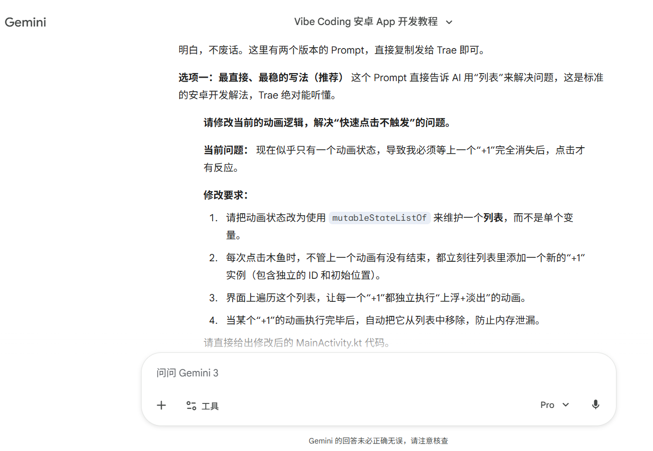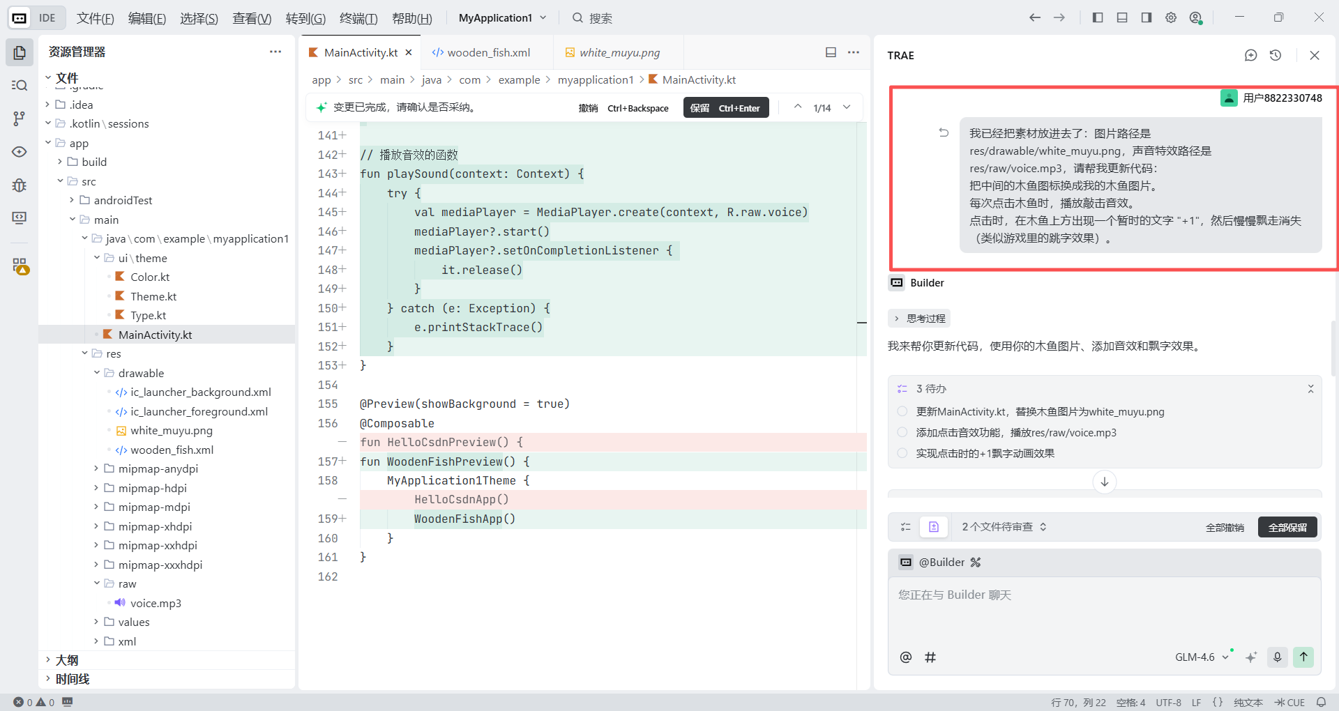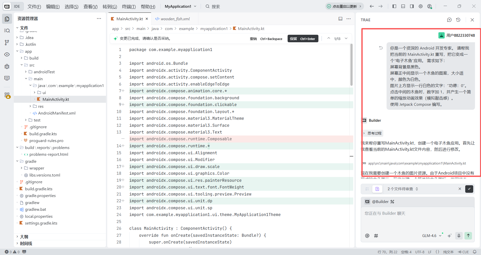 - Trae(AI 工程师) :负责执行指令,将自然语言转化为标准的 Kotlin 代码和 Jetpack Compose 布局,并处理语法错误和逻辑细节。