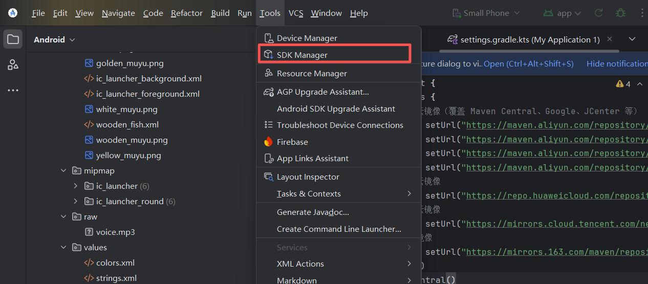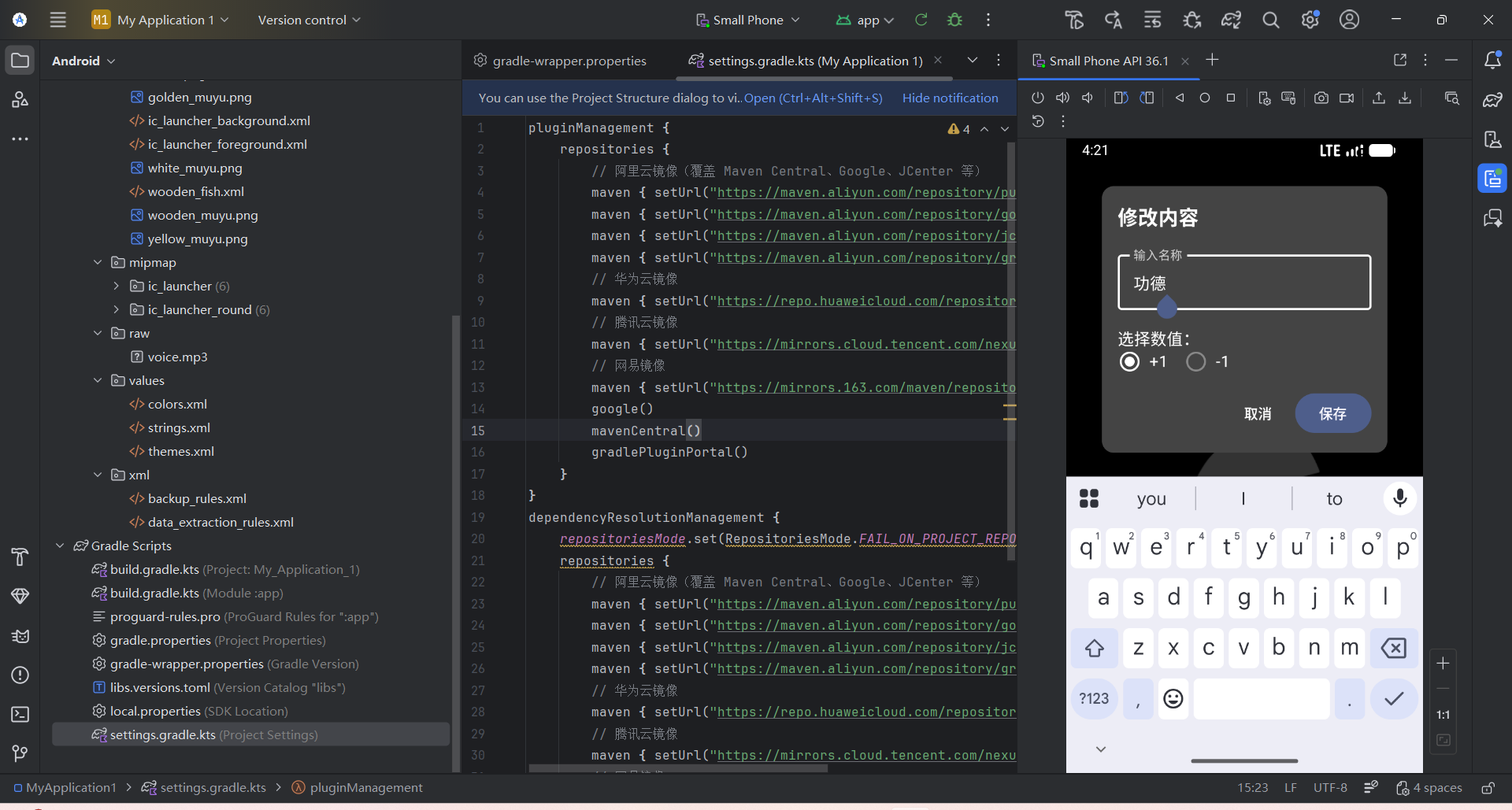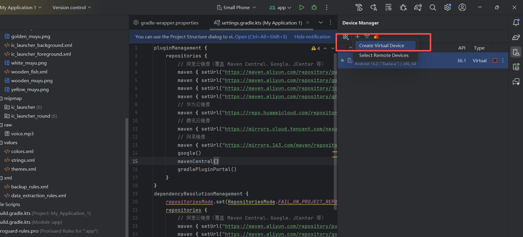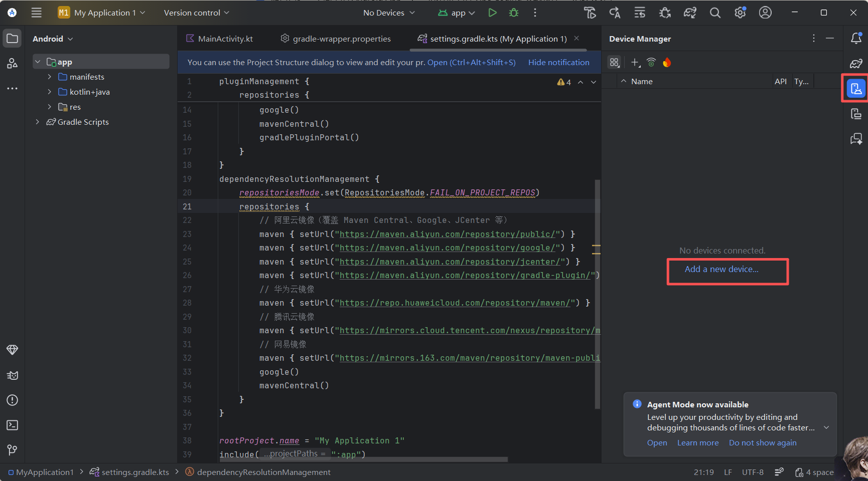 接着,在左侧目录的根节点下找到并打开 settings.gradle.kts 文件。,请将 repositories 大括号内的内容替换为以下代码: