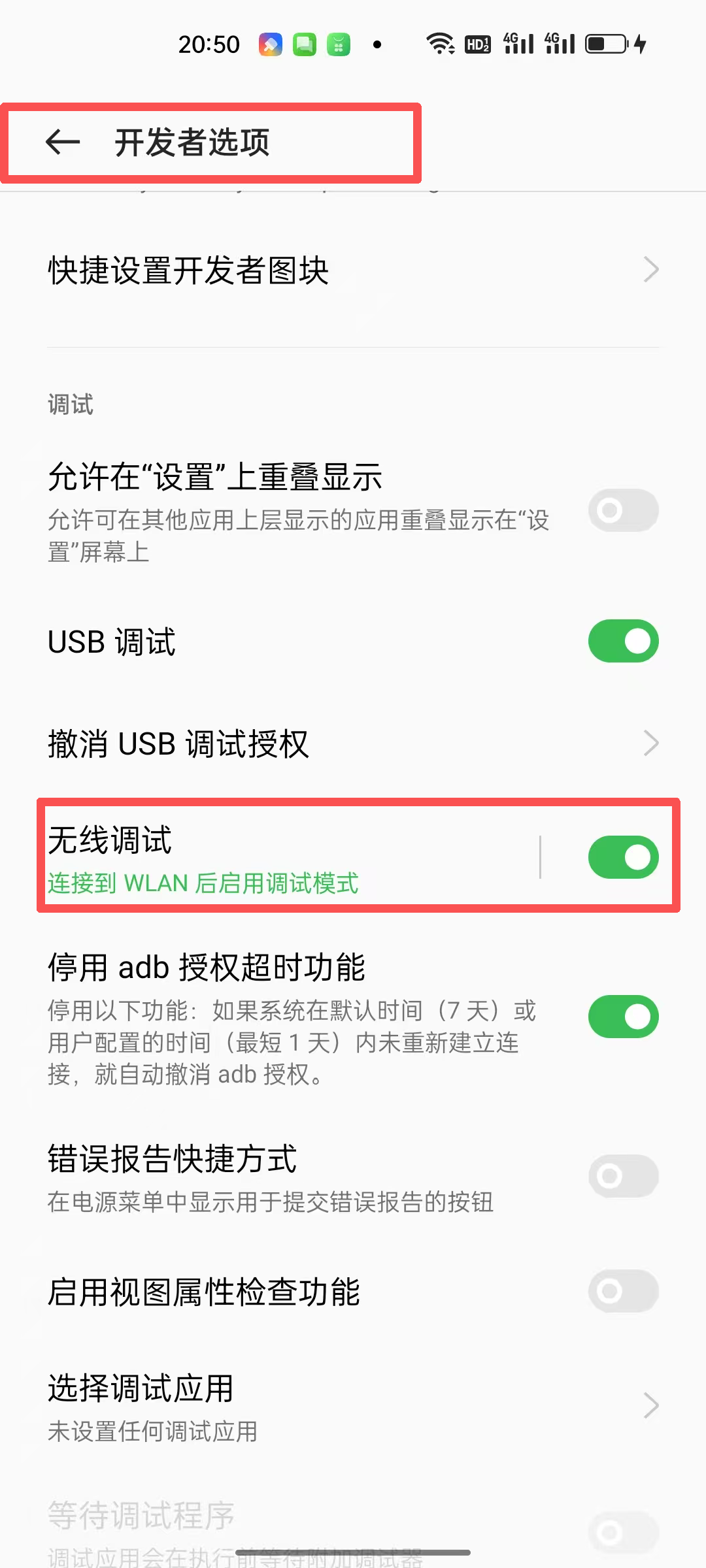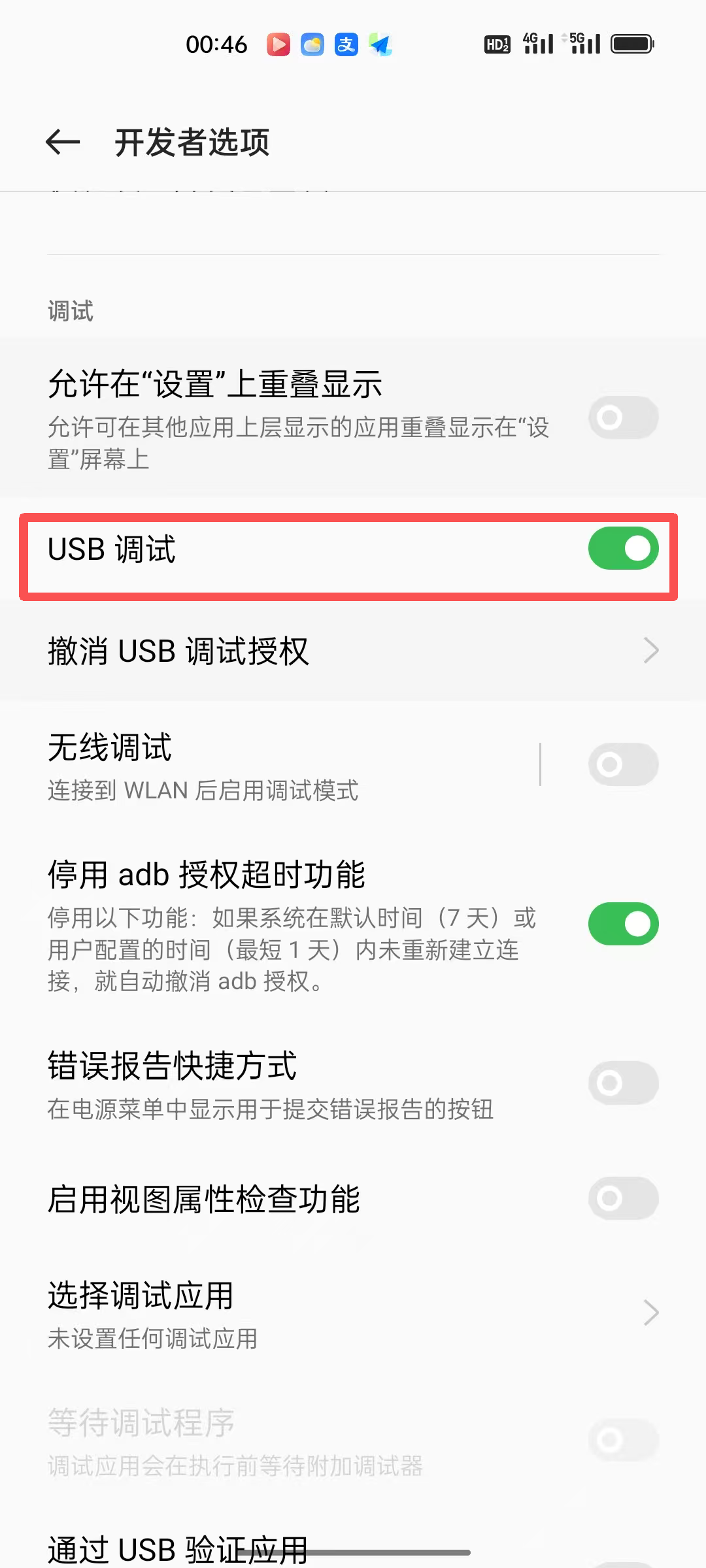 打开手机设置,进入开发者选项,找到并开启 【 USB 调试】 开关。