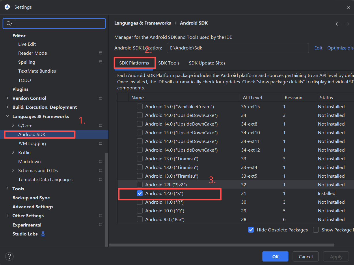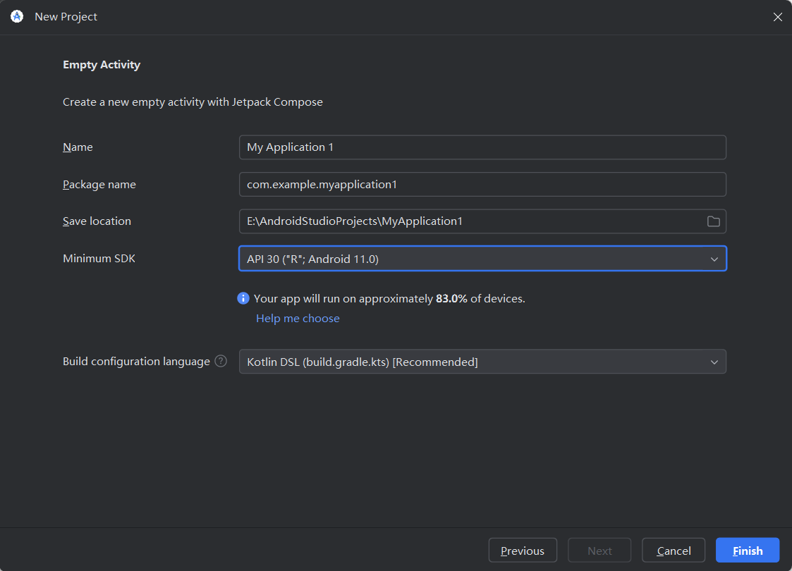 | Save location | 自定义路径(如 E:\AndroidProjects\Myapplication1) | 项目保存位置,不推荐放在C盘 |