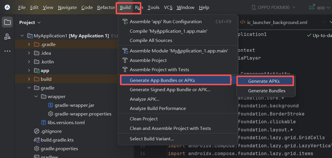 操作步骤非常简单: 在 Android Studio 顶部菜单栏中找到 Build,鼠标悬停在 Generate App Bundles or APKs 上,然后在弹出的子菜单中点击 Generate APKs。