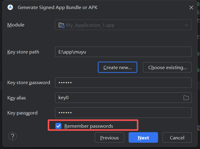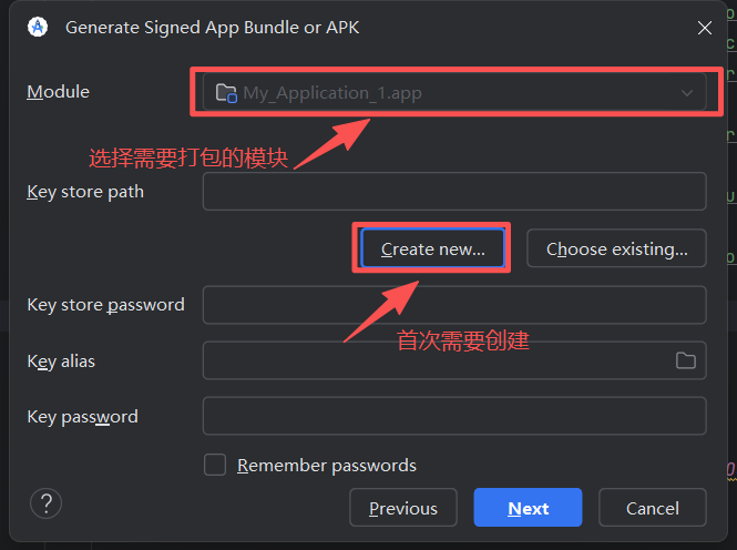 这是新手最容易卡住的地方。因为是第一次打包正式版,我们需要新建一个“密钥库”。 在 Key store path 下方点击 Create new 。