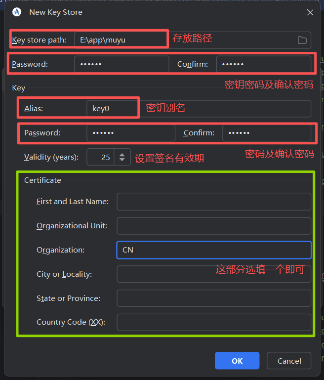 在弹出的窗口中,你需要填写一些信息,就像注册账号一样。这里我们强烈建议密钥库密码和密钥别名密码 设为一样的 ,并且 一定要记下来 !如果密码丢了,你的 App 以后就再也无法更新了。