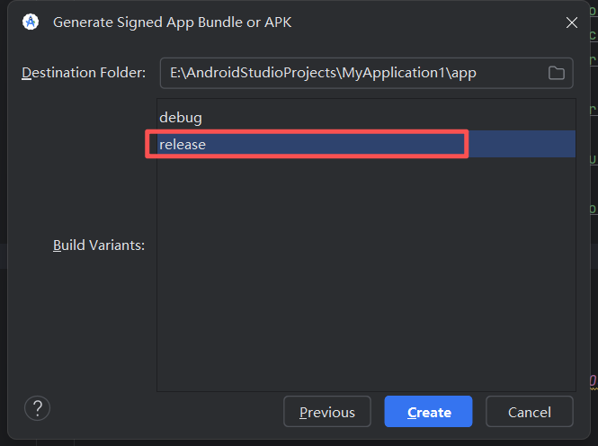 点击 Next,在 Build Variants 中选择 release (正式版),最后点击 Create 。