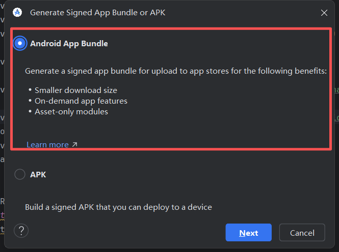 在顶部菜单栏选择 Build,这次我们要点击 Generate Signed Bundle / APK。 在弹出的窗口中,你会面临两个选择: