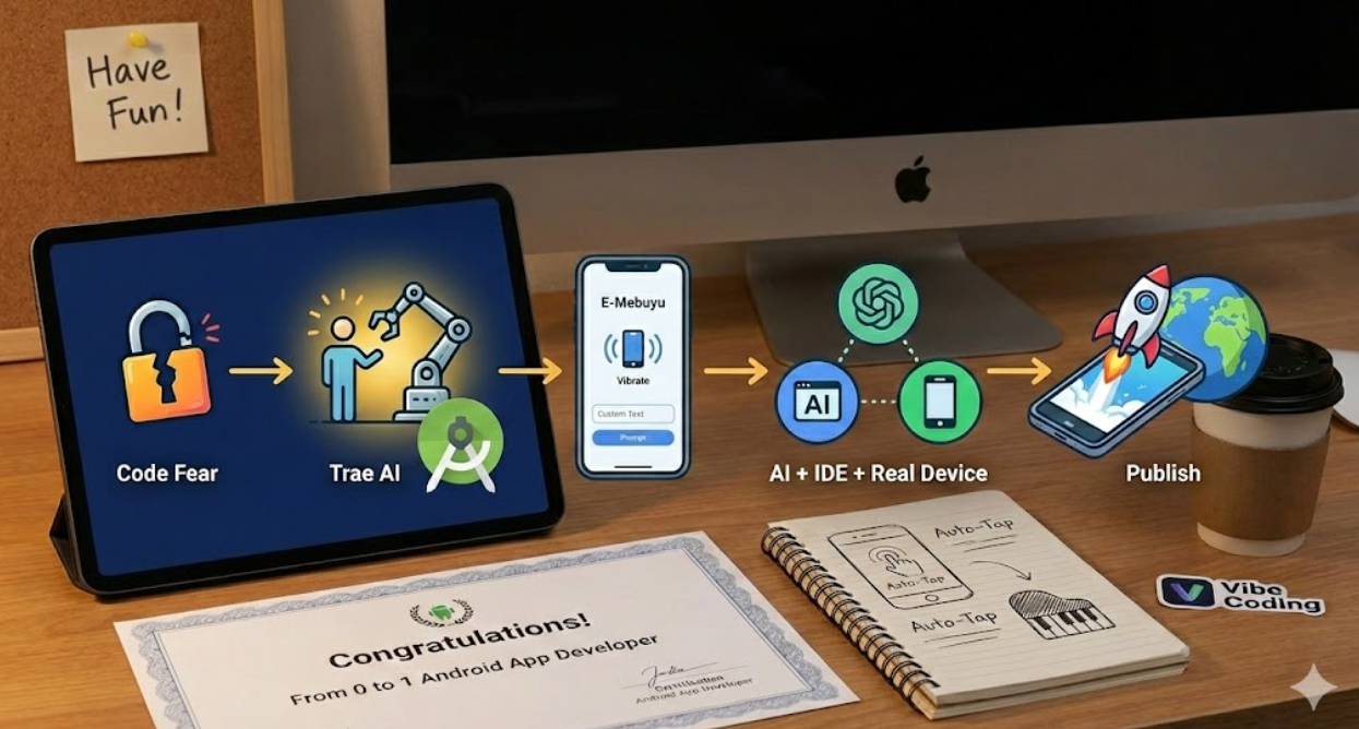 为了让整个学习过程不再枯燥,本教程将全程围绕一个既解压又包含核心技术的案例—— 《电子木鱼》 展开。我们将结合 Trae 的 Vibe Coding 模式,把从零开始到真机运行的过程,拆解为一条你可以反复复用的路线:
