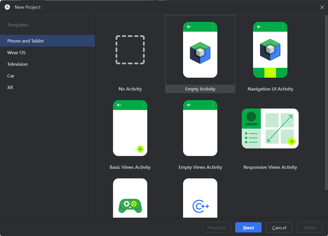 在弹出的模板列表中,请选择 "Empty Activity" (注意图标上有 Jetpack Compose 的标志)。